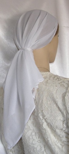 White Poly Sheer Tichel Head Covering with white small rayon cording ties. Drapes beautifully. Well fitted, adjustable, and very soft to the touch. For full coverage use our unique UnderCap (available soon in white!) or some other type of opaque covering.